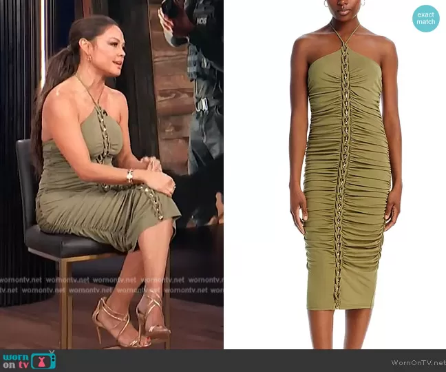on E! News on E! was spotted wearing this green embellished braided halter dress on E! News on Apr 16 2024's episode. 's Dress is the Calian Dress by Cult Gaia.