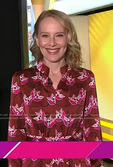 on Today on NBC was spotted wearing this brown floral dress on Today on Apr 16 2024's episode. 's Dress is the Waterlily Print Maxi Dress + Belt in Pecan/Pink/Light Cream by Me + Em.