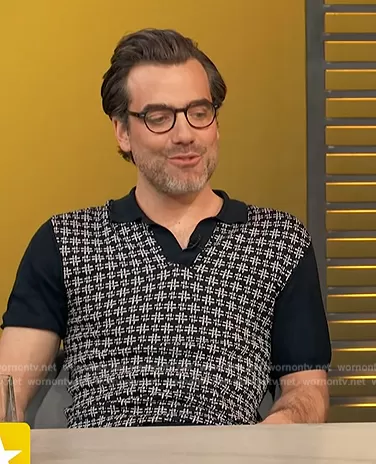 on Access Hollywood on NBC was spotted wearing this black polo on Access Hollywood on Apr 16 2024's episode. 's Shirt is the 007 Horton silk and cotton polo sweater by Orlebar Brown.