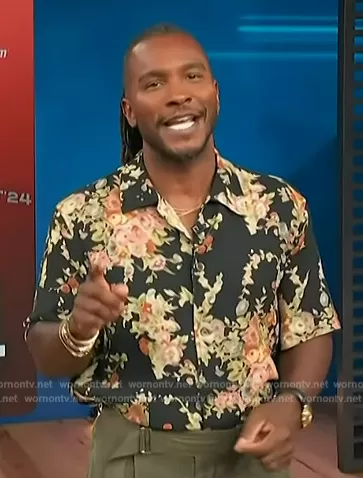 Scott Evans on Access Hollywood on NBC was spotted wearing this black floral print shirt on Access Hollywood on Apr 16 2024's episode. Scott's Shirt is the Elder floral-print cotton shirt by Our Legacy.