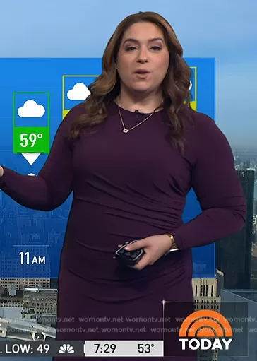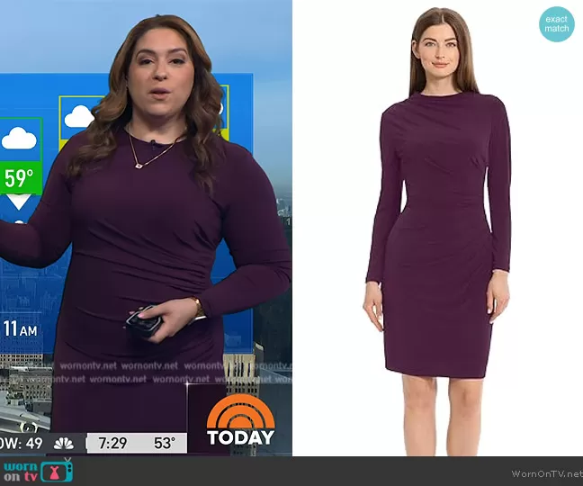 on Today on NBC was spotted wearing this purple ruched dress on Today on Apr 17 2024's episode. 's Dress is the Long Sleeve Side Neck Drape Midi Dress by Maggy London.