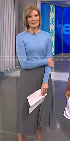 Kate Snow on NBC News Daily on NBC was spotted wearing this blue sweater and grey pleated skirt on NBC News Daily on Apr 17 2024's episode. Kate's Sweater is the Basic Knit Sweater in Cornflower Blue by Zara . Kate's Skirt is the Tropical Wool Pleated Leather Wrap Skirt in Heather Grey by Tibi.