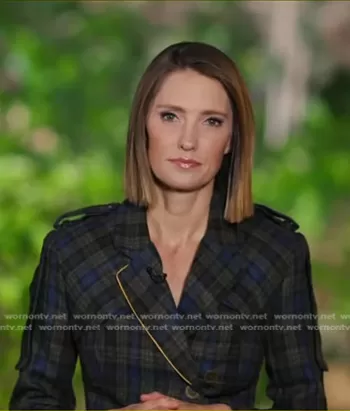 on Good Morning America on ABC was spotted wearing this plaid blazer on Good Morning America on Apr 18 2024's episode. 's Jacket is the Military Plaid Blazer by L.A.M.B..