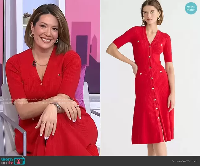 on Today on NBC was spotted wearing this Michelle Collins’ red ribbed button front dress on Today on Apr 19 2024's episode. 's Dress is the Elbow-sleeve button-up sweater-dress by J. Crew.