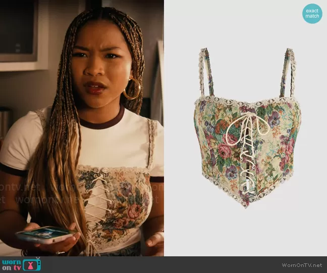 Delilah (played by Laya DeLeon Hayes) on The Equalizer on CBS was spotted wearing this floral lace-up top and printed jeans on The Equalizer on episode 'DOA' (4x06) in Apr 2024. Delilah's Top is the Secret Garden Corset Crop Tank Top by Cider . Delilah's Pants is the Wide-Leg Jacquard Denim Pants by Ganni.
