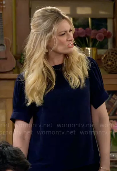 Gemma (played by Beth Behrs) on The Neighborhood on CBS was spotted wearing this navy puff-sleeve top on The Neighborhood on episode 'Welcome to the Baby Shower' (6x08) in Apr 2024. Gemma's Top is the Pleated Puff Sleeve Silk Top by Rebecca Taylor.