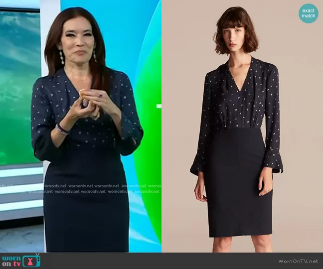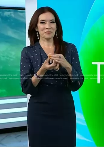 on Today on NBC was spotted wearing this navy print blouse and pencil skirt on Today on Apr 22 2024's episode. 's Dress is the Tailored Dashing Dot Dress in Dark Navy Combo by Rebecca Taylor.