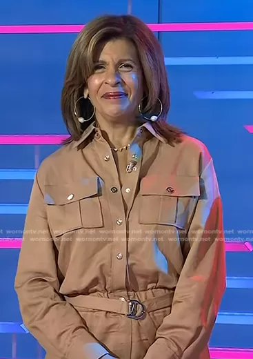 Hoda Kotb on Today on NBC was spotted wearing this beige utility belted jumpsuit on Today on Apr 22 2024's episode. Hoda's Jumpsuit is the Long-Sleeve Belted Jumpsuit by Maje.