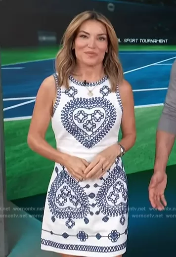 Kit Hoover on Access Hollywood on NBC was spotted wearing this white and blue embroidered dress on Access Hollywood on Apr 23 2024's episode. Kit's Dress is the Clover-embroidered cotton minidress by Maje.