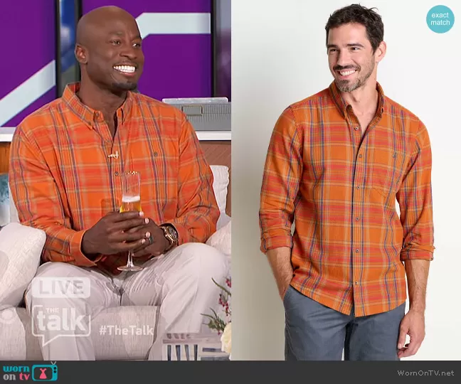 Akbar Gbajabiamila on The Talk on CBS was spotted wearing this orange plaid shirt on The Talk on Apr 22 2024's episode. Akbar's Shirt is the Eddy Shirt in Umber by Toad & Co . Akbar's Shoes is the Air Force 1 '07 LV8 Next Nature "Sun Club" sneakers by Nike.