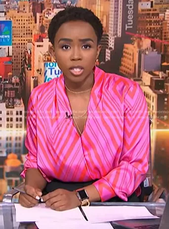 Zinhle Essamuah on NBC News Daily on NBC was spotted wearing this pink striped wrap blouse on NBC News Daily on Apr 23 2024's episode. Zinhle's Top is the Satin Print Blouse in Fuchsia by Mango.
