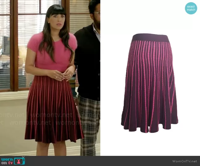 Sam (played by Hannah Simone) on Not Dead Yet on ABC was spotted wearing this pink striped skirt on Not Dead Yet on episode 'Not The End Yet' (2x09) in Apr 2024. Sam's Skirt is the Stripe Skirt by Kimchi Blue.