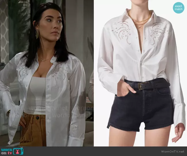 Steffy Forrester (played by Jacqueline MacInnes Wood) on The Bold and the Beautiful on CBS was spotted wearing this white eyelet shirt and fringed shorts on The Bold and the Beautiful on Apr 24 2024's episode. Steffy's Shirt is the Dree Embroidered Silk Blend Button-Up Shirt by Citizens of Humanity . Steffy's Shorts is the Leather Fringe Shorts by The Kooples . Steffy's Earrings is the Farrah Mult-Tonal Chain Earrings by All Saints.