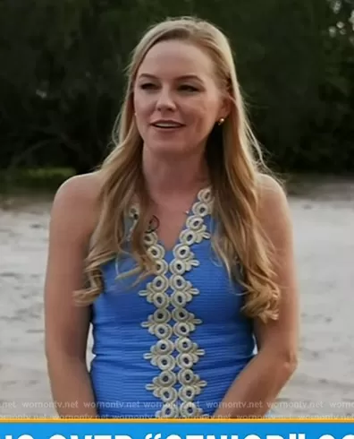 on Today on NBC was spotted wearing this blue lace trim dress on Today on Apr 24 2024's episode. 's Dress is the Lapis Blue Pearl Shift Dress by Lilly Pulitzer.