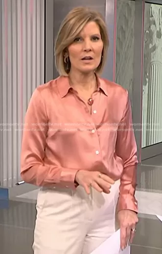 Kate Snow on NBC News Daily on NBC was spotted wearing this pink button down shirt on NBC News Daily on Nov 05 2024's episode. Kate's Top is the Morgane Button-Down Silk Tunic Shirt in Rosewood by Veronica Beard.