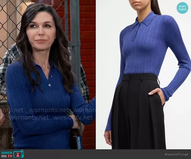 Anna Devane (played by Finola Hughes) on General Hospital on ABC was spotted wearing this blue rib knit polo top on General Hospital on Apr 24 2024's episode. Anna's Top is the Bering Rib Wool-Blend Slim Polo Top by Theory .