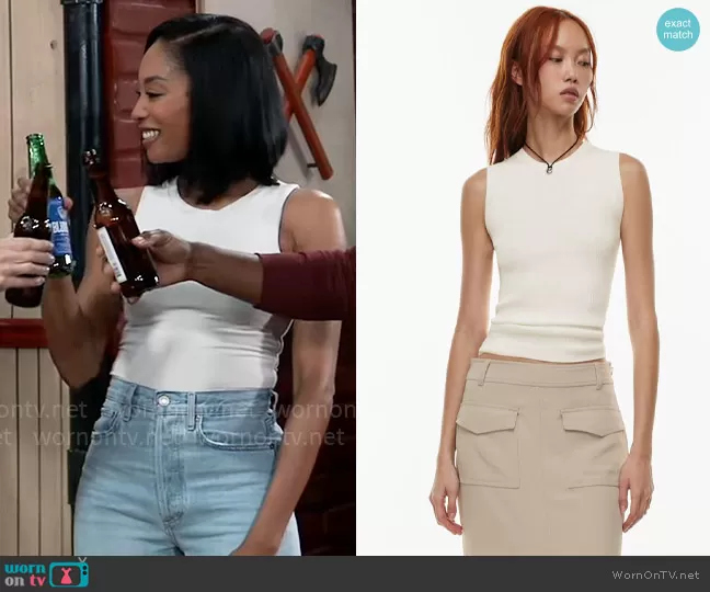Jordan Ashford (played by Tanisha Mariko Harper) on General Hospital on ABC was spotted wearing this white top and jeans on General Hospital on Apr 24 2024's episode. Jordan's Top is the Notes Top by Wilfred at Aritzia .