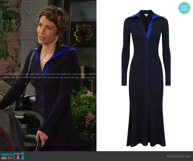 Sarah Horton (played by Linsey Godfrey) on Days of our Lives on Peacock was spotted wearing this navy ribbed button front knit dress on Days of our Lives on Apr 26 2024's episode. Sarah's Dress is the Millie Rib-Knit Henley Midi Dress in Navy Blue by Reiss.
