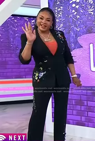 on Today on NBC was spotted wearing this black sequin flower blazer and pants on Today on Apr 25 2024's episode. 's Jacket is the Cheyenne Sequin Flower Blazer by Cinq a Sept . 's Pants is the Kingsley Floral Paillette Pants by Cinq a Sept.
