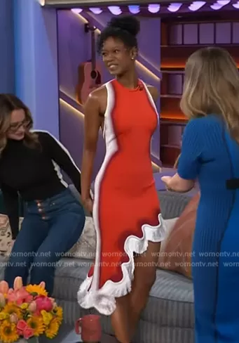 on The Kelly Clarkson Show on NBC was spotted wearing this Joy Woods’ red scalloped fringe dress on The Kelly Clarkson Show on Apr 25 2024's episode. 's Dress is the 2024 Pre Fall Collection by PH5.