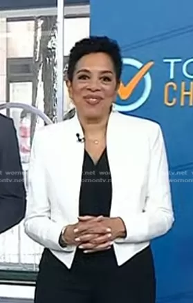 on Today on NBC was spotted wearing this white cropped leather jacket on Today on Apr 25 2024's episode. 's Jacket is the Harvey Draped Open-Front Leather Jacket by Alice + Olivia.