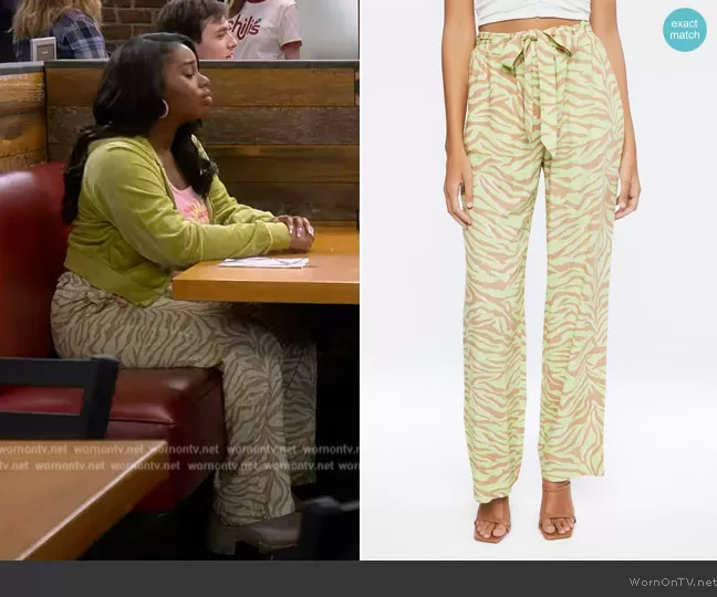 (played by Daria Johns) on The Upshaws on Netflix was spotted wearing this Savanna zebra stripe pants on The Upshaws on episode 'Hail Mary' (5x01) in Apr 2024. 's Pants is the Belted Zebra Print High-Rise Pants by Forever 21.