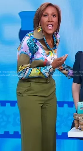 Robin Roberts on Good Morning America on ABC was spotted wearing this green belted pants on Good Morning America on Apr 25 2024's episode. Robin's Pants is the Paperbag-Waist Palazzo Pant by New York & Company.