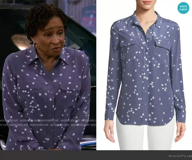 Lucretia Turner (played by Wanda Sykes) on The Upshaws on Netflix was spotted wearing this blue star print shirt on The Upshaws on episode 'Electric Feels' (5x02) in Apr 2024. Lucretia's Top is the Slim Signature Star-Print Shirt by Equipment . Lucretia's Shoes is the Kensley Shoes by Vionic.