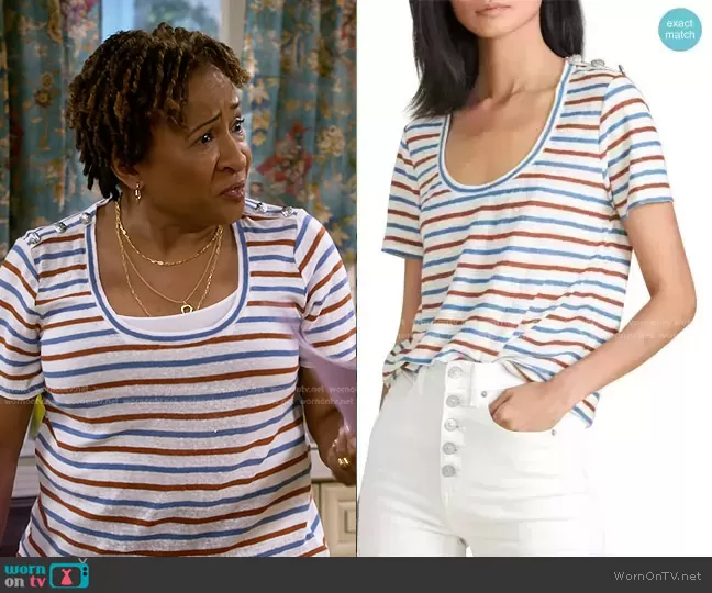 Lucretia Turner (played by Wanda Sykes) on The Upshaws on Netflix was spotted wearing this striped scoop neck tee on The Upshaws on episode 'Background Checkered' (5x03) in Apr 2024. Lucretia's Top is the Benji Stripe Linen T-Shirt by Veronica Beard.