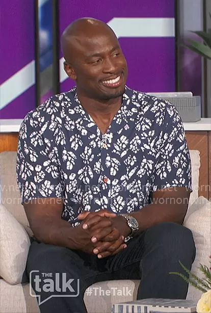 Akbar Gbajabiamila on The Talk on CBS was spotted wearing this navy and white printed short sleeve shirt on The Talk on Apr 26 2024's episode. Akbar's Shirt is the Printed Short-Sleeved Camp Shirt by Scotch & Soda.