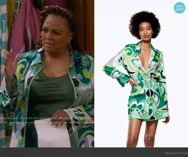 Regina Upshaw (played by Kim Fields) on The Upshaws on Netflix was spotted wearing this green paisley print satin blouse on The Upshaws on episode 'Dating-Tipps' (5x04) in Apr 2024. Regina's Top is the Printed Blouse by Zara.