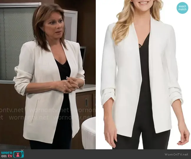 Alexis Davis (played by Nancy Lee Grahn) on General Hospital on ABC was spotted wearing this Alexis’ white blazer on General Hospital on Apr 24 2025's episode. Alexis's Jacket is the Open Front Blazer by DKNY .