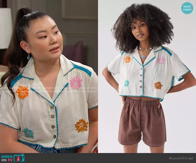 Wendy Shin (played by Victoria Grace) on Days of our Lives on Peacock was spotted wearing this Embroidered cropped shirt on Days of our Lives on Apr 29 2024's episode. Wendy's Top is the Rowan Embroidered Souvenir Button-Down Top by Urban Outfitters . Wendy's Bag is the Sherpa Cell Crossbody Bag by Anthropologie.