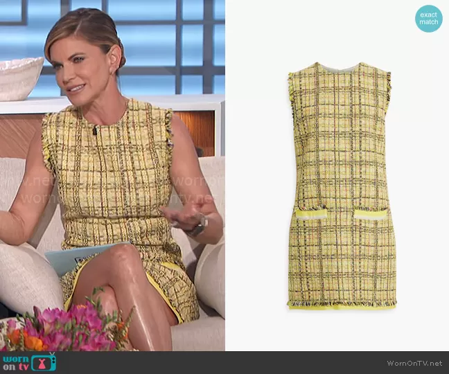 Natalie Morales on The Talk on CBS was spotted wearing this yellow tweed mini dress on The Talk on Apr 29 2024's episode. Natalie's Dress is the Frayed cotton-blend tweed mini dress by MSGM . Natalie's Shoes is the Baby Horsebit Slingback Platform Pump by Gucci.