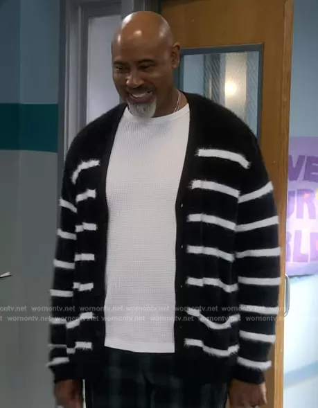 (played by Lamont Thompson) on The Upshaws on Netflix was spotted wearing this black striped faux fur cardigan on The Upshaws on episode 'Do I?' (5x06) in Apr 2024. 's Sweater is the Tyler Regular-Fit Striped Cardigan by I.N.C. International Concepts.