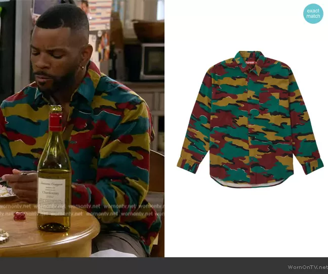 (played by ) on The Upshaws on Netflix was spotted wearing this camo print jacket on The Upshaws on episode 'Do I?' (5x06) in Apr 2024. 's Jacket is the Flannel Shirt by Supreme.