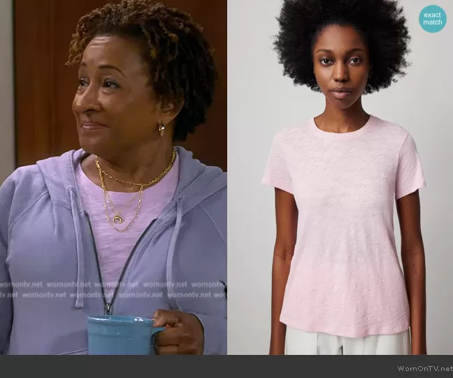 Lucretia Turner (played by Wanda Sykes) on The Upshaws on Netflix was spotted wearing this pink tee on The Upshaws on episode 'Do I?' (5x06) in Apr 2024. Lucretia's Top is the Slub Jersey Schoolboy Short Sleeve Crew Neck Tee in Ballet Pink by ATM Anthony Thomas Melillo . Lucretia's Necklace is the Mixed Chain Chunky Crescent Moon Necklace Set by Madewell.