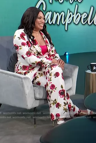on Access Hollywood on NBC was spotted wearing this white floral print suit on Access Hollywood on Apr 30 2024's episode. 's Blazer is the Portia Floral Print Blazer by Nadine Merabi . 's Pants is the Portia Floral Print Pants by Nadine Merabi.