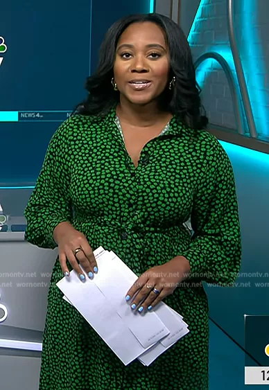 Kay Angrum on NBC News Daily on NBC was spotted wearing this green floral shirtdress on NBC News Daily on Sep 23 2024's episode. Kay's Dress is the Shirt Dress with Tie Belt in Black/green floral by H&M.