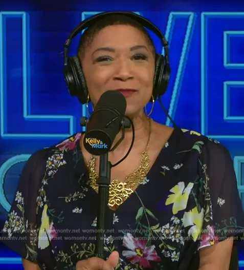 Deja Vu on Live with Kelly and Mark on Disney ABC Home Entertainment was spotted wearing this floral print wrap dress on Live with Kelly and Mark on May 01 2024's episode. Deja Vu's Dress is the Floral-Print Flutter-Sleeve Asymmetrical Faux-Wrap Dress by DKNY.