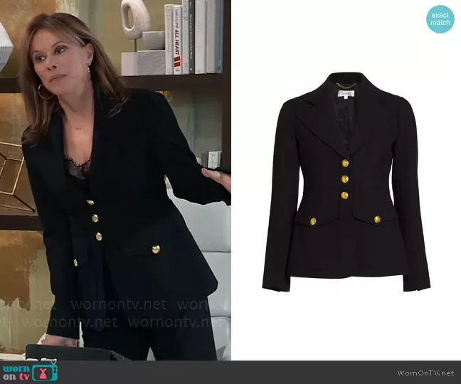 Alexis Davis (played by Nancy Lee Grahn) on General Hospital on ABC was spotted wearing this Alexis’ black blazer with gold buttons on General Hospital on May 02 2024's episode. Alexis's Jacket is the Amelia Jacket by A.L.C..