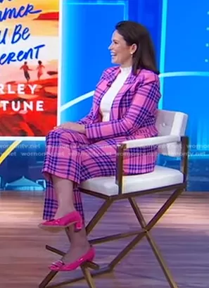 on Good Morning America on ABC was spotted wearing this pink plaid blazer and pants on Good Morning America on May 02 2024's episode. 's Jacket is the Hutton Blazer by Smythe . 's Pants is the Cropped Cotton Plaid Flood Pants by Smythe . 's Shoes is the Belle Metal Buckle Pumps by Roger Vivier.