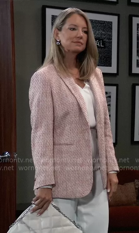 Nina Reeves (played by Cynthia Watros) on General Hospital on ABC was spotted wearing this pink tweed blazer on General Hospital on May 02 2024's episode. Nina's Jacket is the Tweed One-Button Notched-Collar Jacket by Anne Klein .