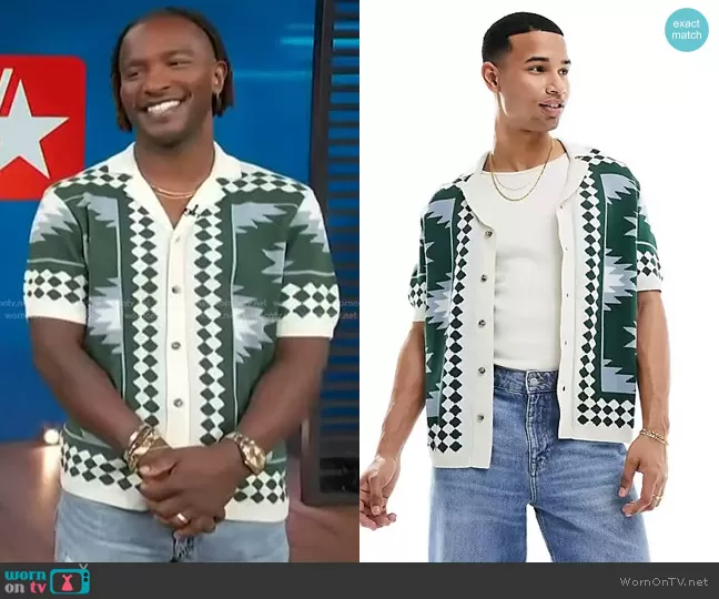 Scott Evans on Access Hollywood on NBC was spotted wearing this white and green geometric print shirt on Access Hollywood on Aug 30 2024's episode. Scott's Shirt is the Relaxed Knit Button Up Polo in stone and blue with geometric border pattern by Asos.