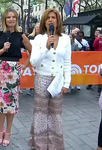 Hoda Kotb on Today on NBC was spotted wearing this white cardigan and paisley print flare pants on Today on May 06 2024's episode. Hoda's Sweater is the Lavira Button Cardigan by Cara Cara . Hoda's Pants is the Paisley Print Belted High Waist Linen Wide Leg Pants by Zimmermann.