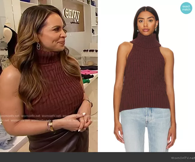 Carolina Bermudez on E! News on E! was spotted wearing this brown turtleneck top on E! News on May 06 2024's episode. Carolina's Top is the Marlow Sleeveless Top by Stitches and Stripes.