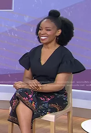 on Today on NBC was spotted wearing this black floral jumpsuit on Today on May 07 2024's episode. 's Jumpsuit is the Memsi Opulent Fauna Jumpsuit by Ted Baker.