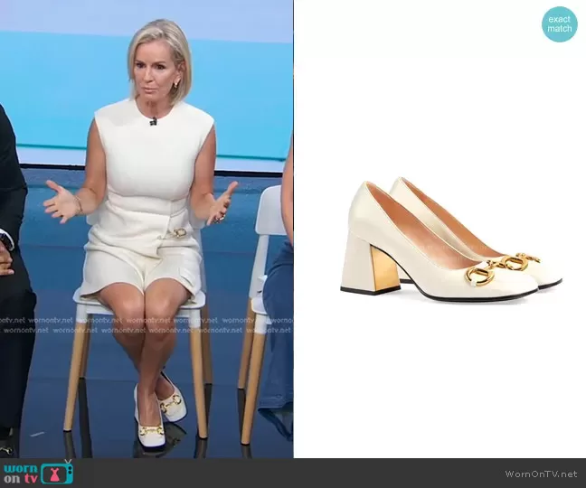 Dr. Jennifer Ashton on Good Morning America on ABC was spotted wearing this white horsebit pumps on Good Morning America on May 07 2024's episode. Jennifer's Shoes is the Horsebit Mid-Heel Pumps by Gucci.