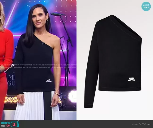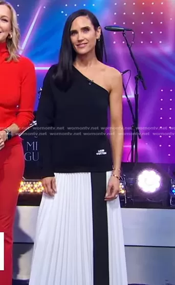 on Good Morning America on ABC was spotted wearing this black one-shoulder top and white pleated skirt on Good Morning America on May 08 2024's episode. 's Sweater is the One-Shoulder Technical Knit Pullover by Louis Vuitton . 's Skirt is the Bow Detail Pleated Wrap Skirt . 's Earrings is the Idylle Blossom Mono Chain Earring in White Gold And Diamonds by Louis Vuitton.