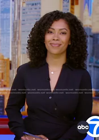 Shirleen Allicot on Good Morning America on ABC was spotted wearing this navy asymmetric button shirtdress on Good Morning America on May 08 2024's episode. Shirleen's Dress is the Wright Long Sleeve Dress by Veronica Beard.